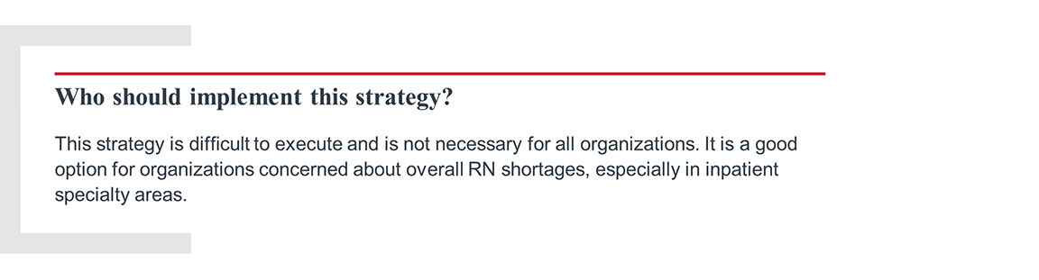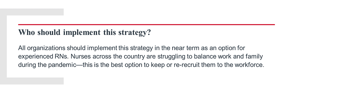 This isn’t a new strategy, as many organizations have developed enticing options to keep late-career nurses in practice longer. But as more late- and mid-career nurses leave, provider organizations must scale this strategy to all experienced RNs who need flexible work options.