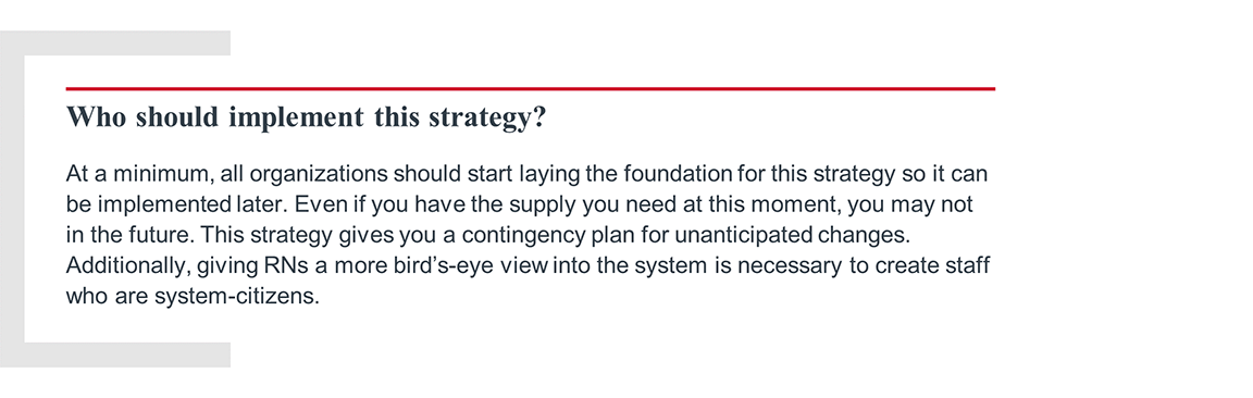 This strategy is ambitious and will take years. Organizations will iterate and progress over time. In the short term, early success and learning will help you respond to fluctuations in demand and staff using less agency labor. Meanwhile, you are building the blocks to create a nursing enterprise comprised of system-citizens.