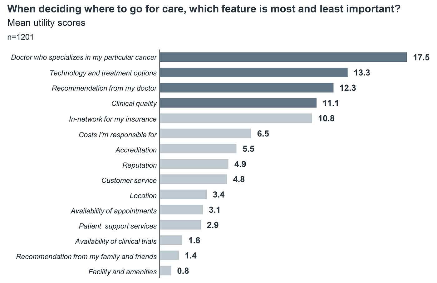 We won’t bury the lede. When deciding where to go for care, patients want a physician who specializes in their particular kind of cancer. As far as the most valuable service? Specialized symptom management and all of their care in one location. See what else we found below.
