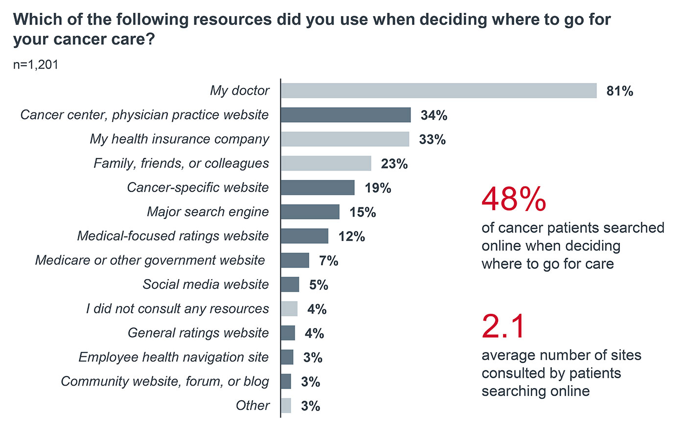 How are patients researching potential providers? We also asked cancer patients what resources they referenced when choosing where to go for care. While patients still highly value their doctor's recommendation, it is clear that online resources play a significant role in patients’ search for information about where they go for care.