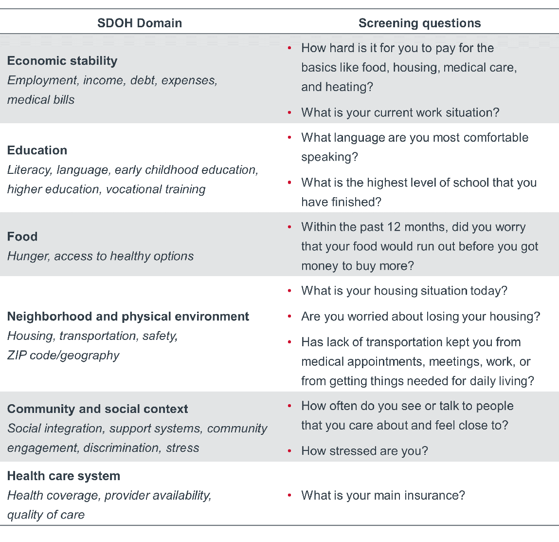 According to the World Health Organization, SDOH are “the conditions in which people are born, grow, live, work and age.” These social factors have a profound impact on patients’ health status, and estimates show they can account for up to 60% of an individual’s health outcomes. However, health systems frequently do not account for patients’ social needs that may drive differences in care experiences and health outcomes. Collecting SDOH data gives health care providers a more comprehensive understanding of barriers to care. When combined with traditional clinical data, SDOH data promotes more effective care planning and interventions for individual patients, as well as a more accurate population risk assessment. Although collecting SDOH data may require more time and/or resources, it should ultimately save costs and effort because the patient’s care plan is aligned with their needs from the start.